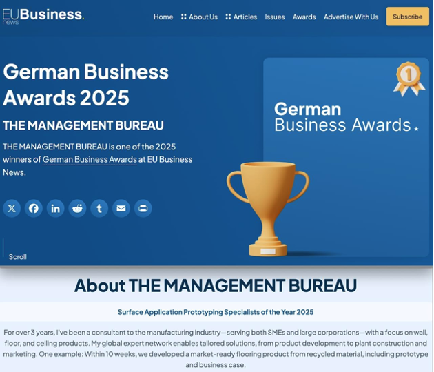 With over 25 years of proven leadership and strategic expertise in the furniture surface and flooring industries, we deliver premium senior management services tailored to your needs. Our focus areas include innovative product development, expert patent consulting, streamlined production optimization, and effective sales support. We also provide targeted project management with a strong emphasis on digital printing solutions – turning ideas into market-ready results.